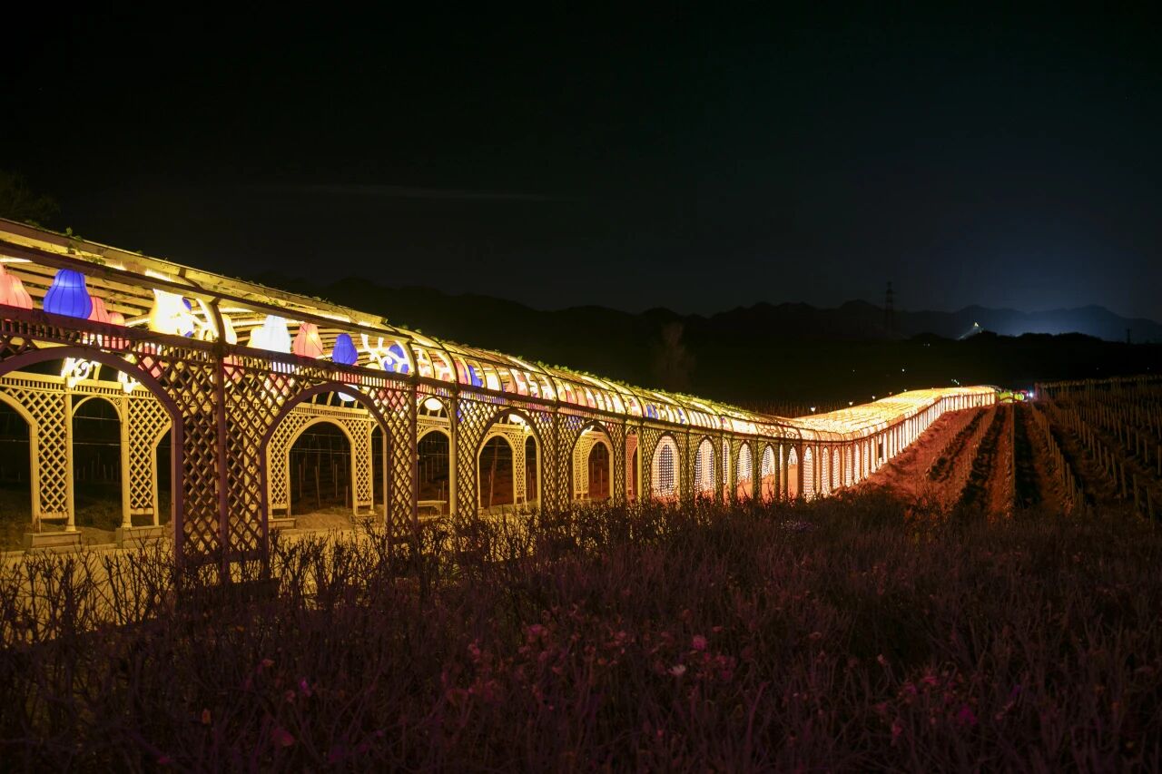葡萄长廊被万盏彩灯缠绕,形成梦幻光影廊道,灯光透过枝叶洒下斑驳光点,漫步其中宛如步入童话世界;许愿亭悬挂着各式祈福牌,游客可写下新春心愿,在灯火映照下寄托美好期盼。