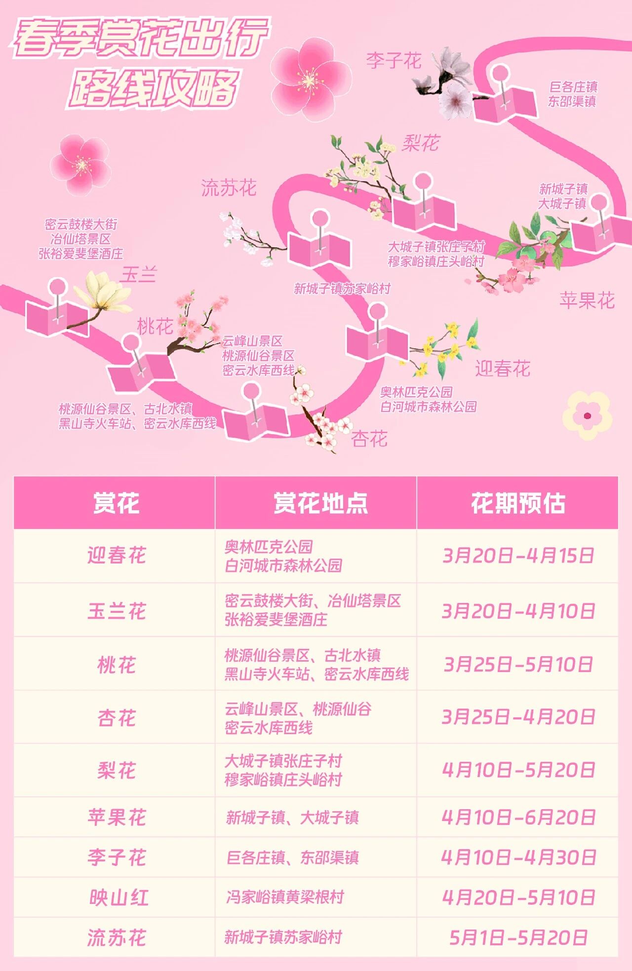 推荐赏花地点:桃源仙谷景区、古北水镇、黑山寺村火车站附近、密云水库西线