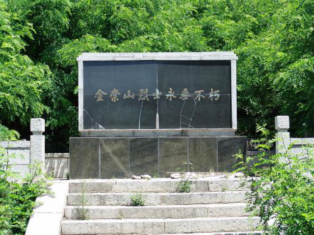 十一点左右,金崇山被拉到西大庙后山坡,这里早已挖好一个长方形大吭,四周站着被驱赶来的百姓和强迫挖大沟的民工,外面密布日伪军,他们手握上着刺刀的大枪,监视着老百姓。日74 军小队长赤哲和王翻译官走到金崇山面前,再次逼问金崇山降不降?金崇山避开赤哲的提问,面对着周围的群众大声讲道:“父老乡亲们!我虽然就要被日寇杀害了,你们不要害怕,日本帝国主义长不了,最后的胜利是我们的!”金崇山讲的话,使日伪军吃惊,也使赤哲狼狈不堪,他再也不向金崇山劝降了,急忙命令日军把金崇山推人大吭。又强令民工向里铲土,黄土一铲一铲的扔进大坑,从金崇山的脚下迅速升起,金崇山没有害怕,更没有一点想要投降的表示。土愈积愈高,金崇山的半个身子已被埋在土里,赤哲忽然命令民工停止铲土,他走到大吭边沿,再次逼问金崇山降不降,并且讲道只要金崇山说出一个“降”字,马上就把他从大坑内拉上来,如果拒不投降就要继续向吭内铲土。金崇山听了赤哲的话后,坚定地讲:“今天你们杀了我,二十年后又是一个我,还要抗日,中国人民是杀不绝的!”赤哲看到金崇山宁死不降,知道劝降的计划已经遭到彻底失败,遂强令民工再次向吭内铲土,黄土升到胸部,金崇山的呼吸愈来愈困难,他使出最后的力气高呼:“打倒日本帝国主义”“中国共产党万岁!……。金崇山呼喊着抗日口号,双肩被埋上了,头部也被埋上了。 但是他不肯这样就死去,他还要和残暴的日本侵略者斗争,他挣扎着,挣扎着,头顶把黄土堆顶的乱摇动,日军看到金崇山这样顽强不屈、英勇斗争都惊呆了。日军小队长赤哲害怕了,急令两名日军上前用刺刀去扎土堆下的金崇山,一个日军连扎两刺刀,不知刺刀扎在什么地方,用尽力气也拔不出来,日军吓得面色如土,急忙跪在地下向金崇山叩头祈祷,请求宽恕。后来,另一日军上去二人一起拔,才把刺刀拔出。而我们的金崇山就这样惨死在日本侵略者的屠刀下,时年二十三岁。