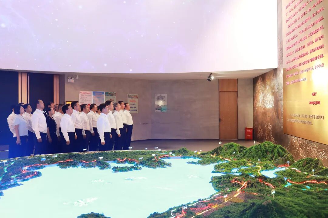 余卫国一行集体步入密云水库展览馆展厅,重温了习近平总书记重要回信嘱托,参观了“决策篇、建设篇、移民篇、保水篇、发展篇”五大主题展区和《密云水库形胜图》,通过沙盘、老照片、场景还原、多媒体互动、声光电配合等多种方式,详细了解密云水库的建设史、移民史和奉献史,以及密云区多年来把保水护水作为头等大事,坚持生态优先、绿色发展所取得的标志性成果。大家在讲解员的引导下徐徐前进,边听边看,深入了解背后的故事,不时驻足讨论。