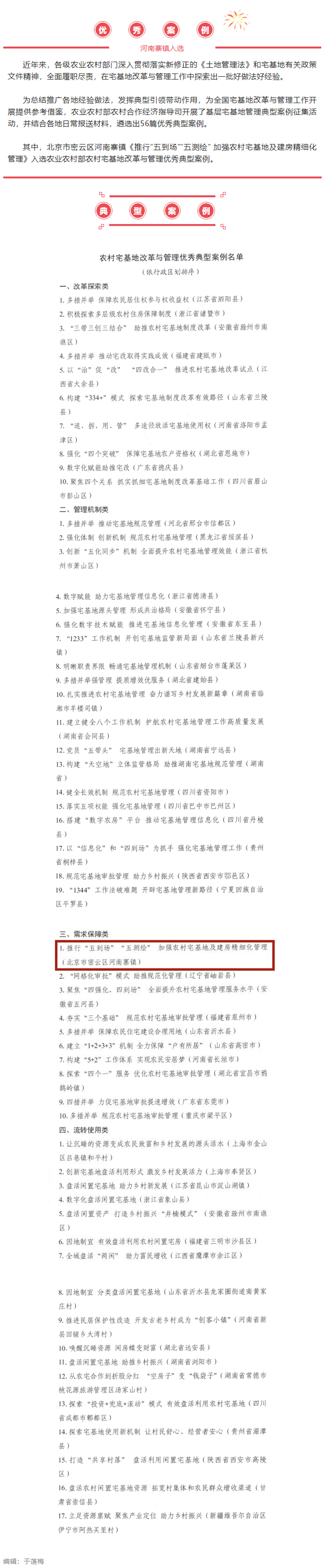 密云河南寨镇入选农业农村部农村宅基地改革与管理优秀典型案例