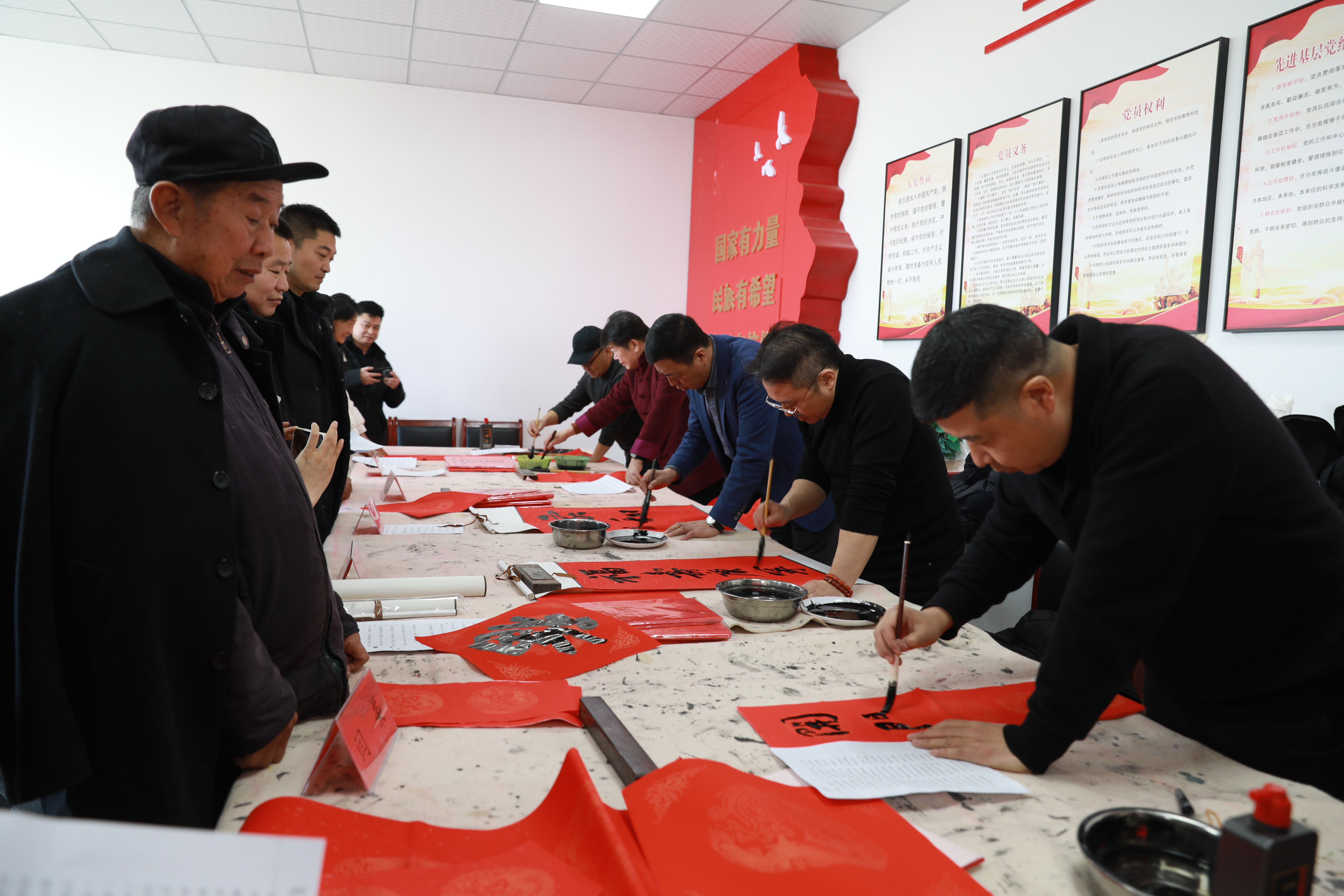 会议室中,十余张长桌一字排开,空气中交织着新研墨香与熬糖的甜香。十余位来自市区两级的书法家、美术家面前早已围满了乡亲。