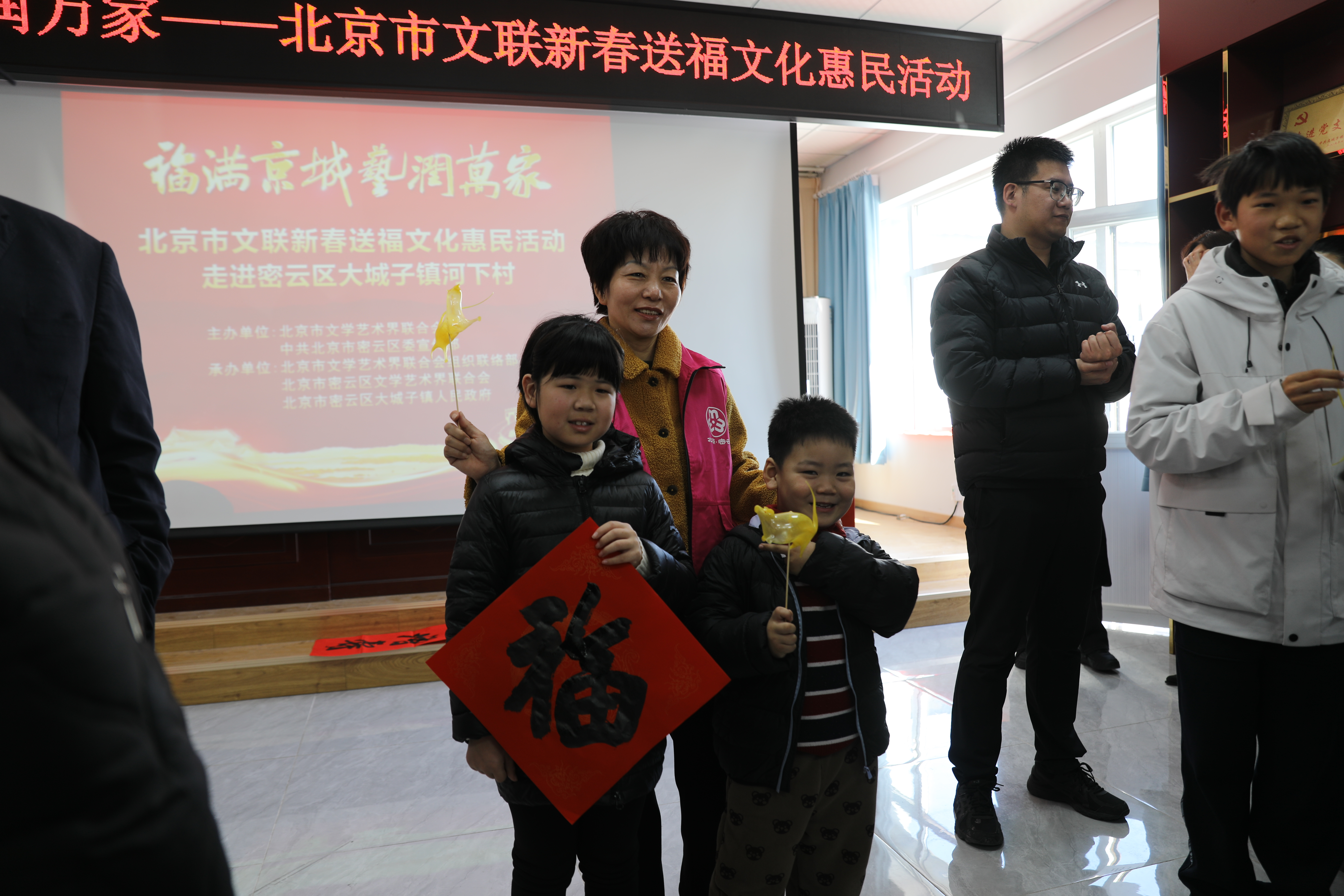“腊月二十五,推磨做豆腐”。农历小年刚过,密云区大城子镇河下村便飘起了浓浓的年味儿。2月12日上午,村委会院子里的热闹景象驱散了冬日的寒意——由市、区文联联合举办的“新春送福”文化惠民活动,正在这里热火朝天地展开。