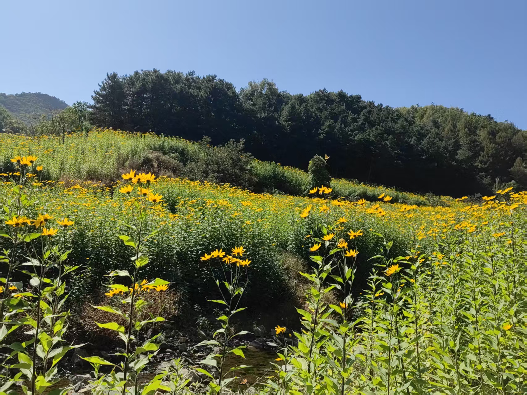 秋日的冯家峪镇南台子村,正被一片绚烂的“金色海洋”包裹——近200亩鬼子姜花海迎风绽放,细碎的黄花缀满枝头,随风摇曳间,不仅成了山间最动人的风景,更藏着村民们靠特色农业增收的“致富密码”。