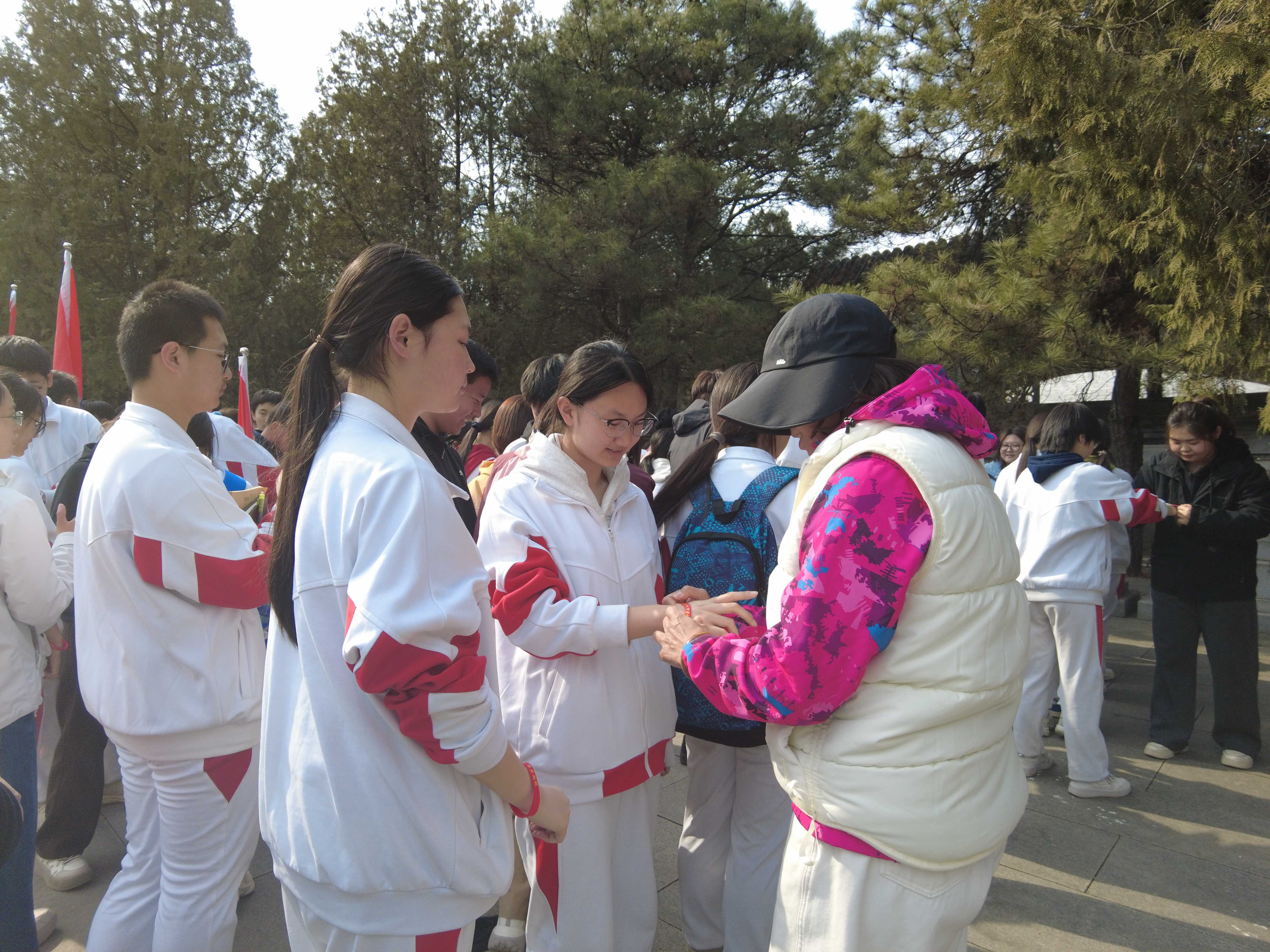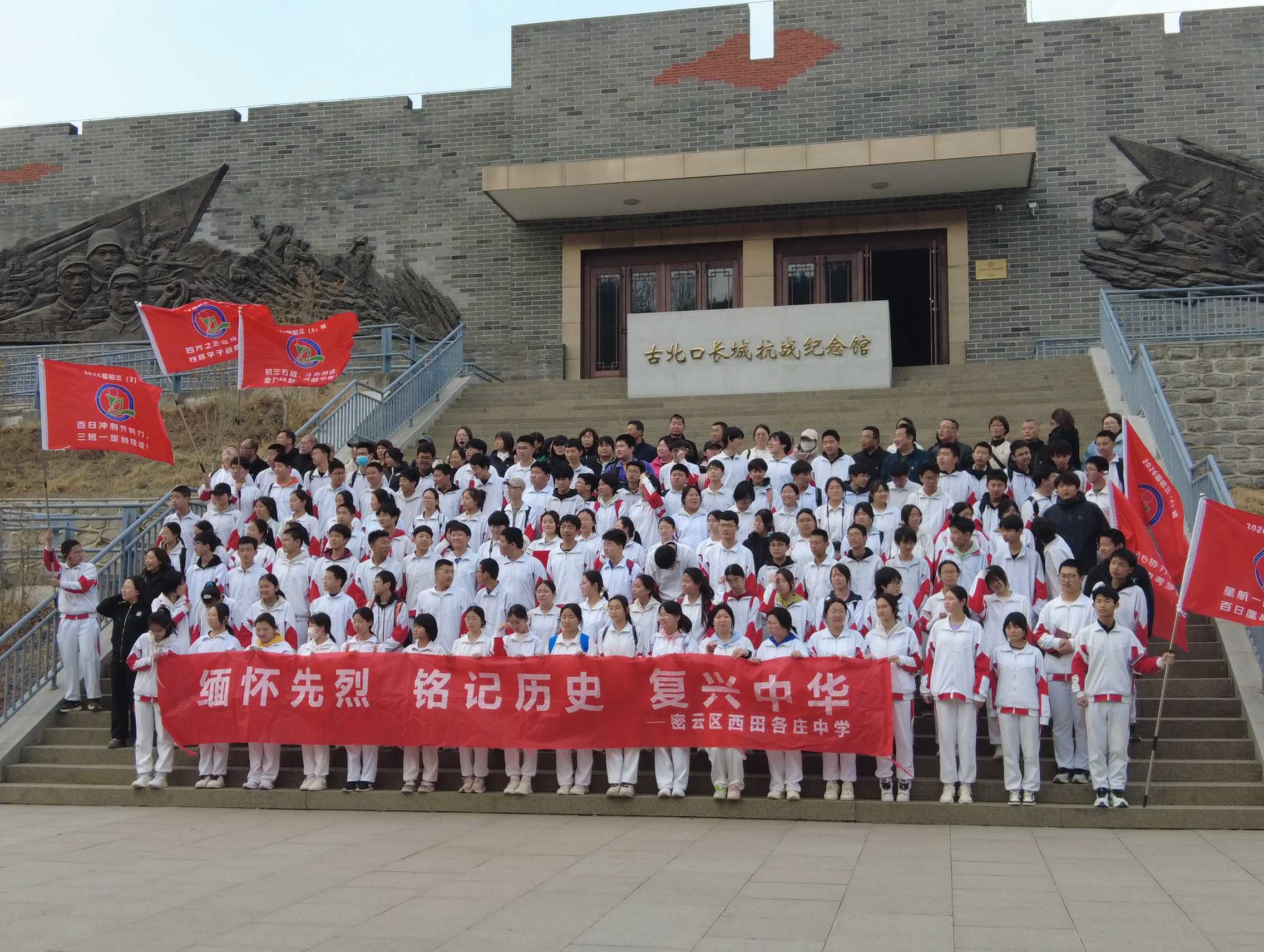 下午,全体人员前往古北口长城抗战纪念馆参观学习。在庄严肃穆的烈士陵园,举行了简短而隆重的百日誓师仪式。学生代表向烈士墓敬献花圈,全体师生肃立默哀。学生代表、家长代表先后发言,表达冲刺决心与殷切期望。同学们互赠励志腕带,并以铿锵誓言集体明志。党支部书记、校长作动员讲话,勉励同学们传承先烈精神,以坚韧意志决胜中考。
