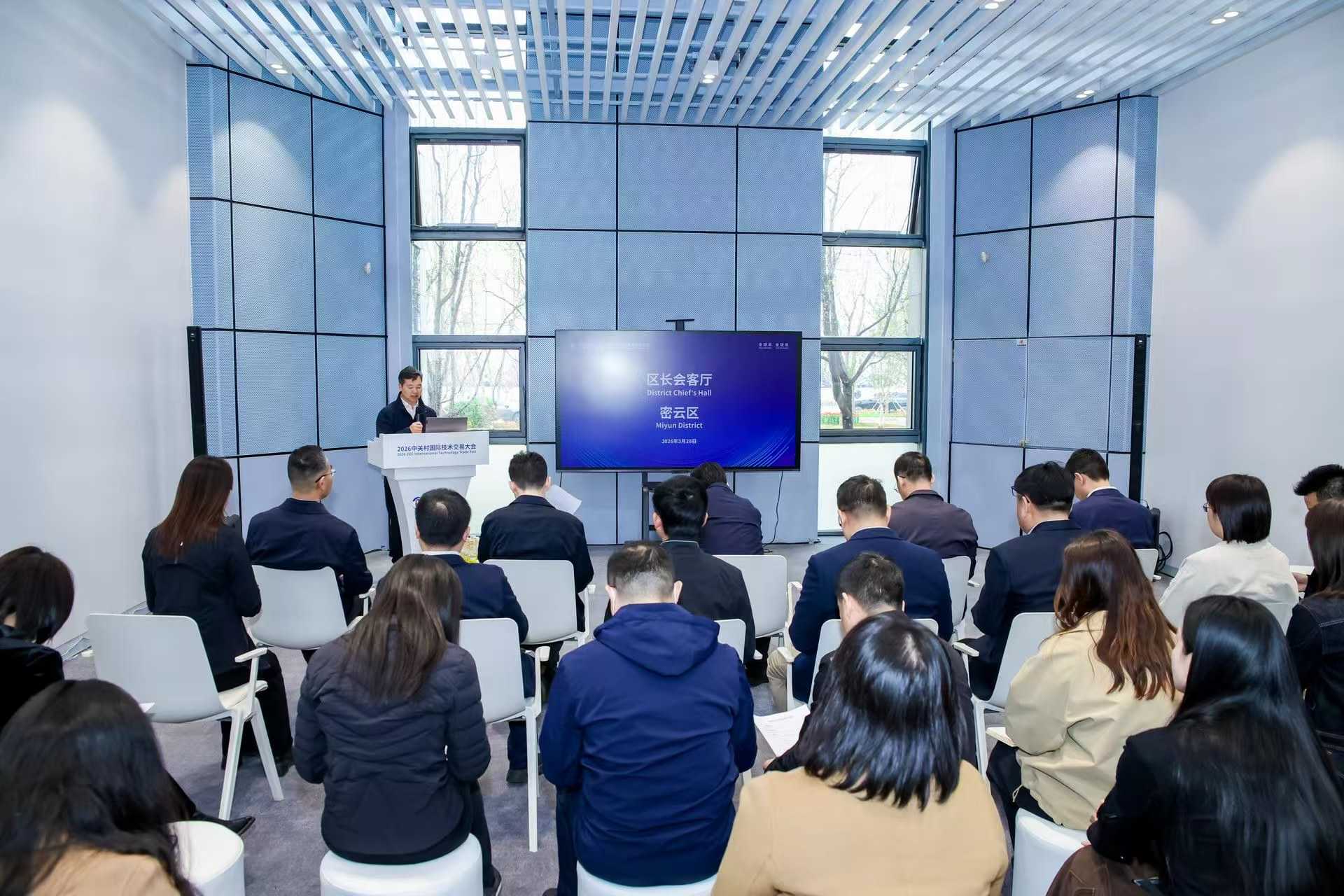3月28日下午,2026中关村论坛年会中关村国际技术交易大会“区长会客厅”密云区专场在中关村国际技术交易中心成功举办。密云区政府副区长施辉阳,区投资促进服务中心党组书记、主任金海江,中关村密云园工委书记、管委会主任张治,区经济和信息化局副局长王效辉出席活动,与创新项目代表深入交流。区科委党组书记、主任彭根明主持活动。