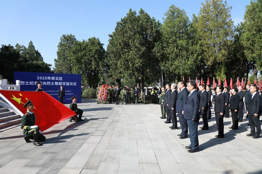 秋日的密云区烈士陵园,青松挺立、翠柏环抱,革命烈士纪念碑巍然耸立,气氛庄严肃穆。上午九时三十分,公祭仪式开始。烈士纪念号角悠扬响起,礼兵们迈着庄重的步伐,护送着鲜艳的国旗至烈士纪念碑前。随着雄壮的旋律响起,全体人员齐唱中华人民共和国国歌,激昂的歌声在烈士陵园上空久久回荡。奏唱国歌完毕,全场肃立,向为中国人民解放事业和共和国建设事业英勇献身的烈士默哀。随后,少先队员代表高唱《我们是共产主义接班人》,唱响少先队员继承革命先辈光荣传统的誓言。
