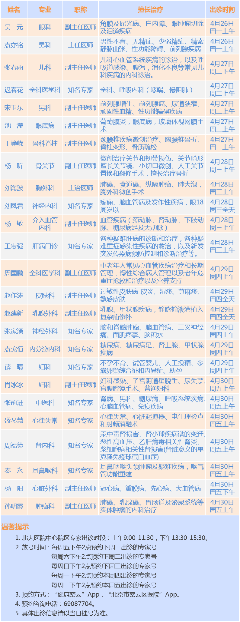 北大医院中心院区专家密云院区出诊安排(2021.4.26-4.30)