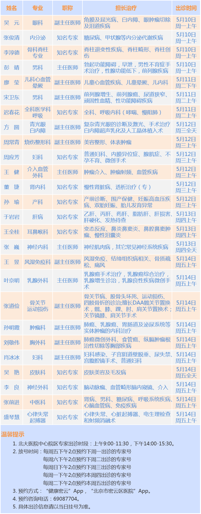 北大医院中心院区专家密云院区出诊安排(2021.5.10-5.14)