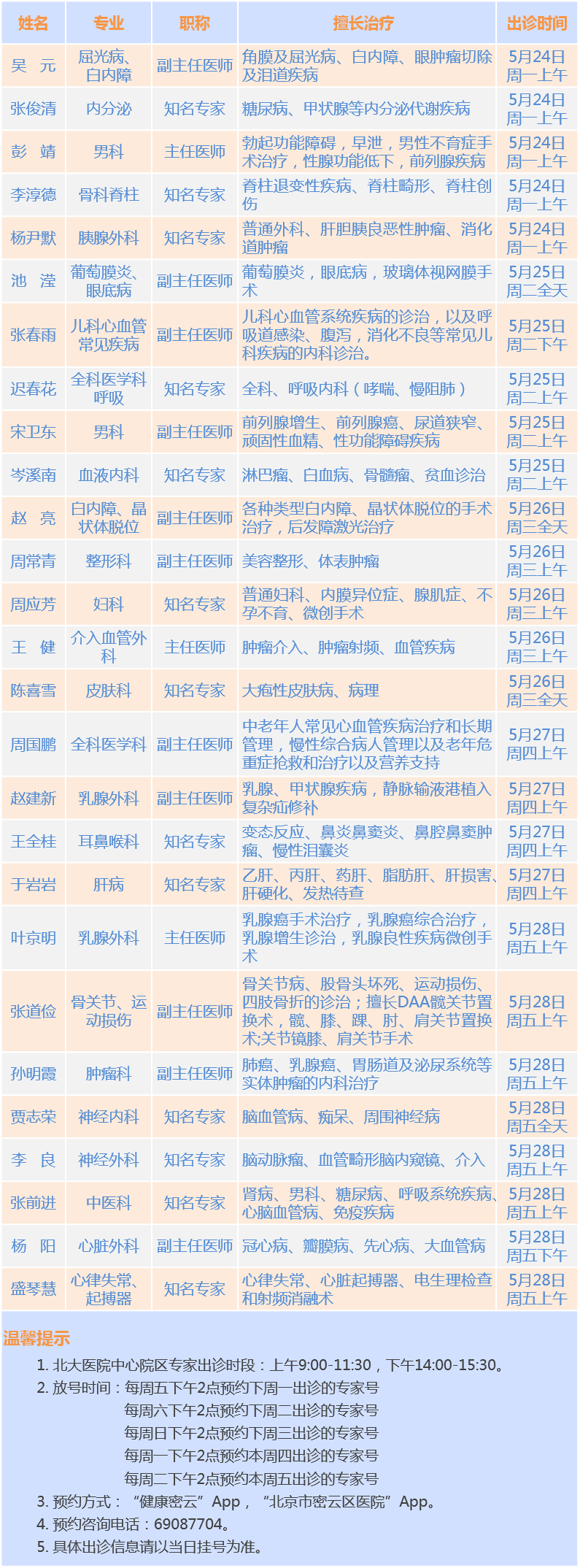 北大医院中心院区专家密云院区出诊安排(2021.5.24-5.28)