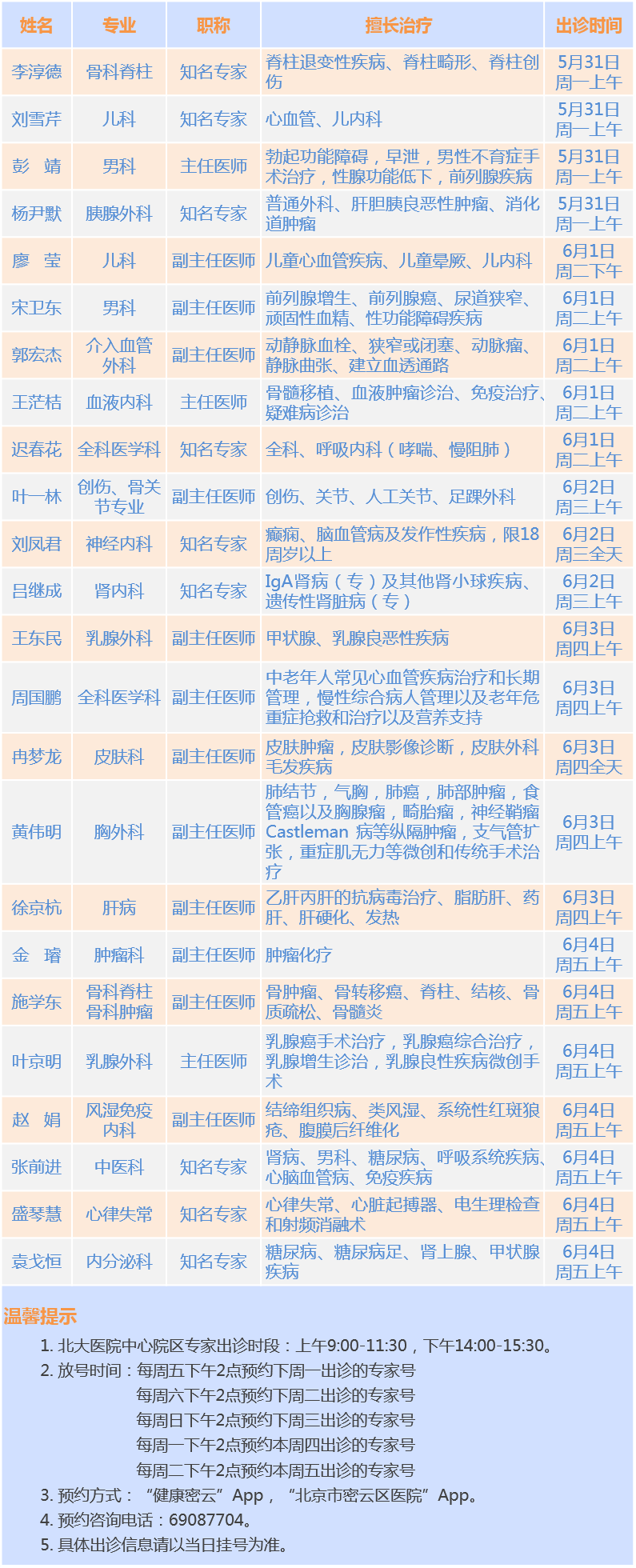 北大医院中心院区专家密云院区出诊安排(2021.5.31-6.4)