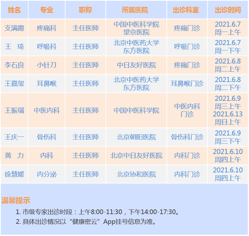 市级专家到密云区中医医院出诊情况(2021.6.7-6.13)
