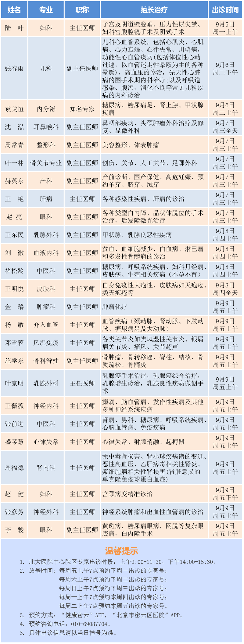 北大医院中心院区专家密云院区出诊安排(2022.9.5-9.9)