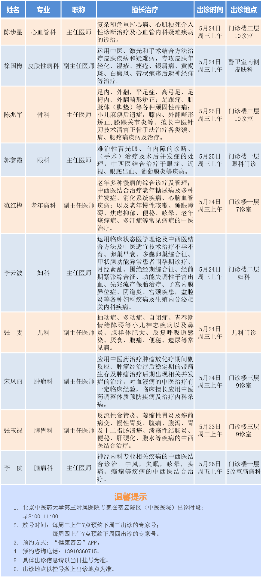 北京中医药大学第三附属医院专家密云院区出诊安排(2023.5.22-5.28)