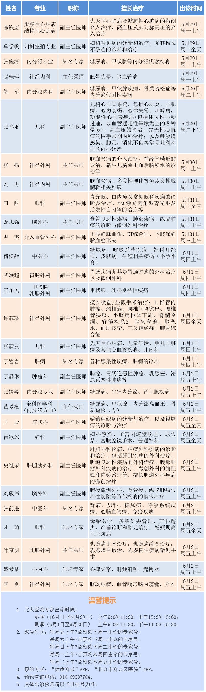 北京大学第一医院专家密云医院出诊安排(2023.5.29-6.2)