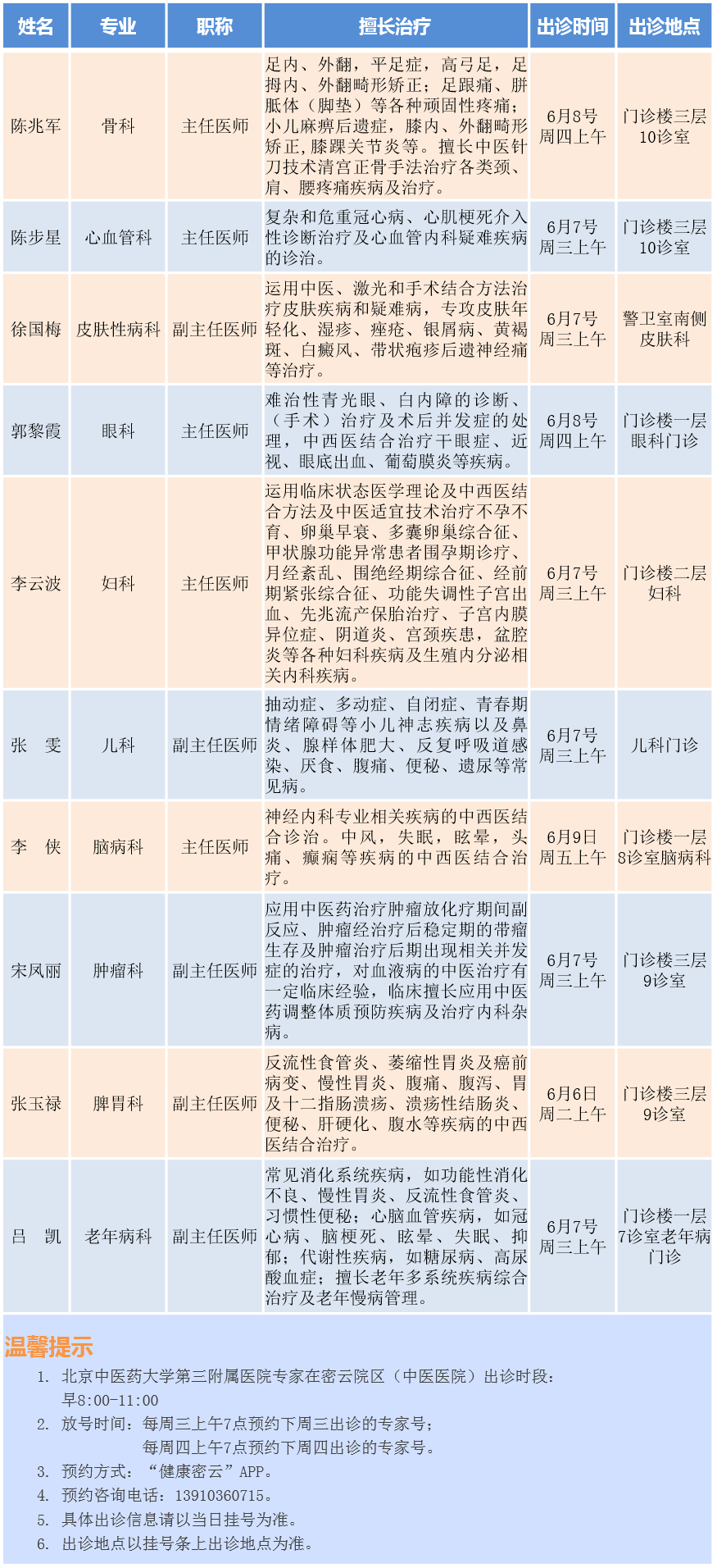 北京中医药大学第三附属医院专家密云院区出诊安排(2023.6.5-6.11)