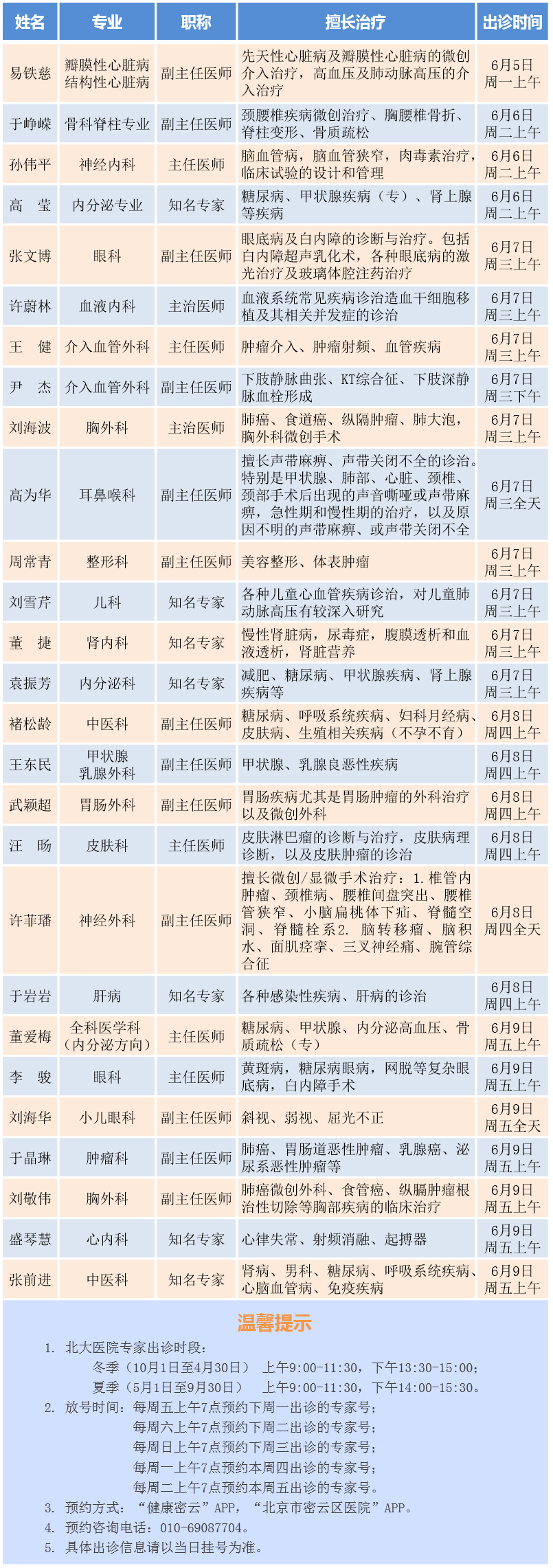 北京大学第一医院专家密云医院出诊安排(2023.6.5-6.9)