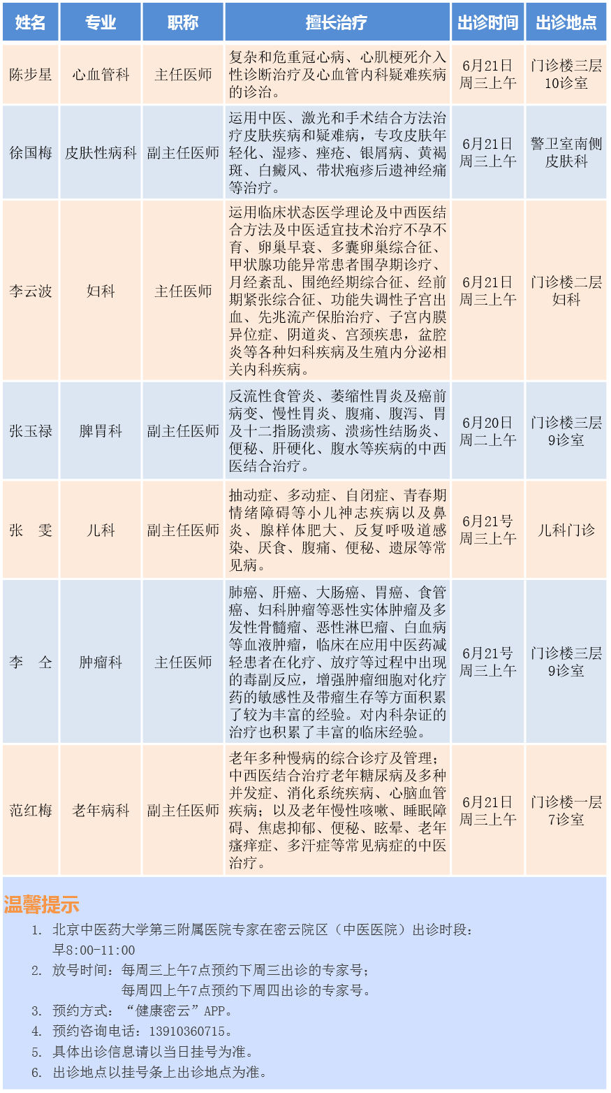 北京中医药大学第三附属医院专家密云院区出诊安排(2023.6.19-6.25)