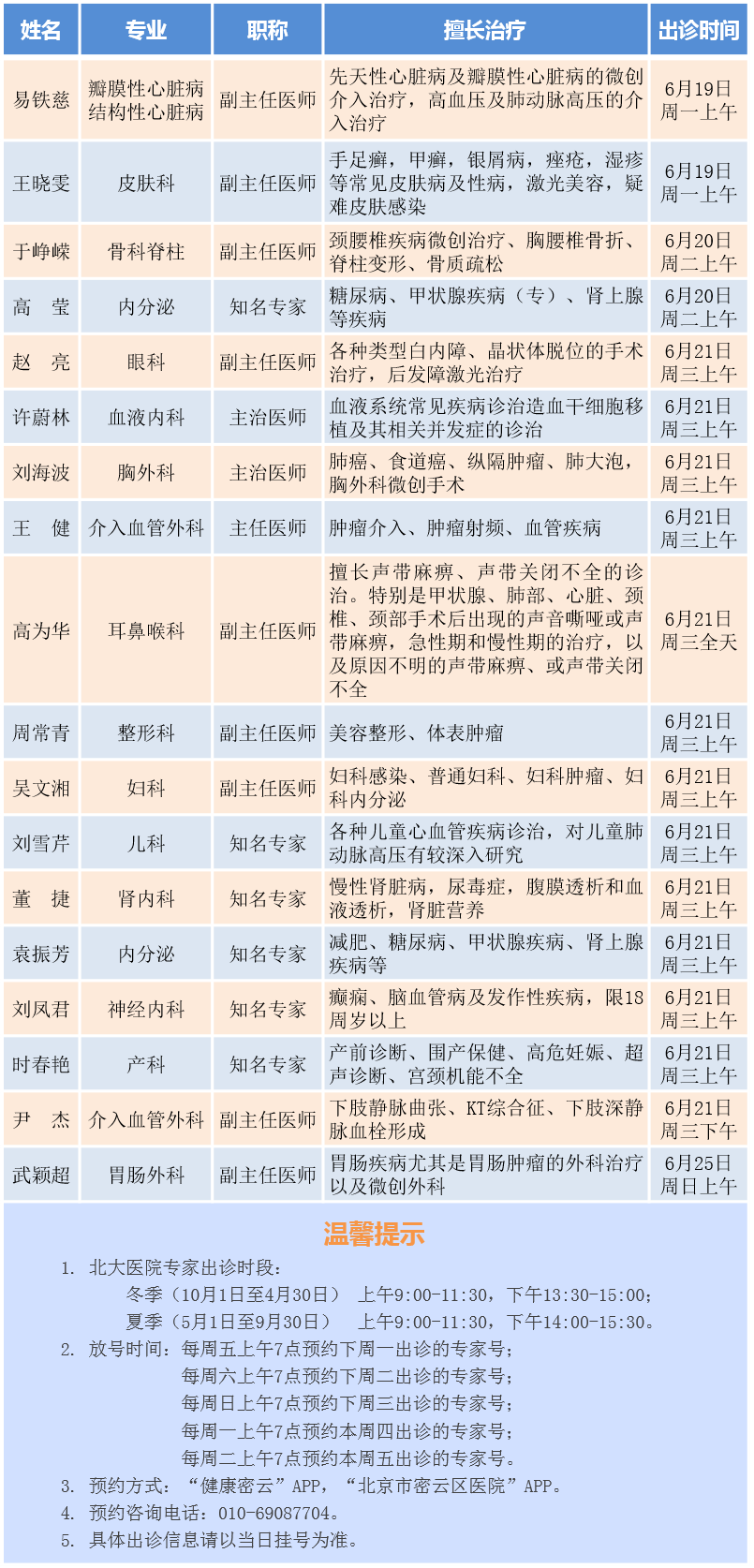 北京大学第一医院专家密云医院出诊安排(2023.6.19-6.25)