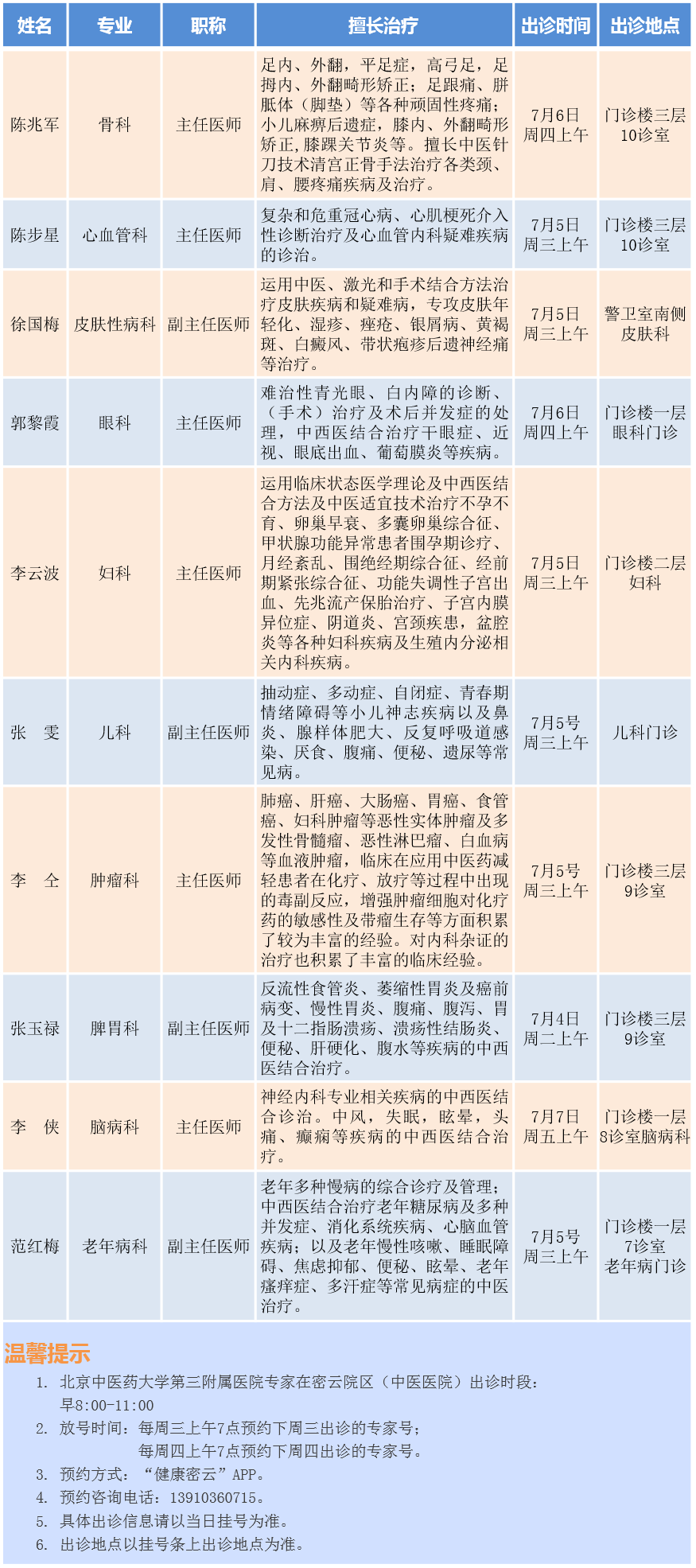 北京中医药大学第三附属医院专家密云院区出诊安排(2023.7.3-7.9)