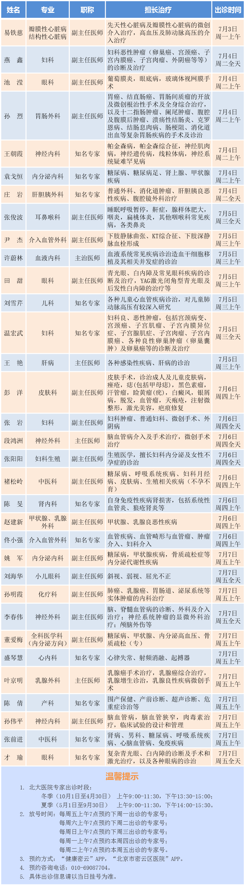 北京大学第一医院专家密云医院出诊安排(2023.7.3-7.7)