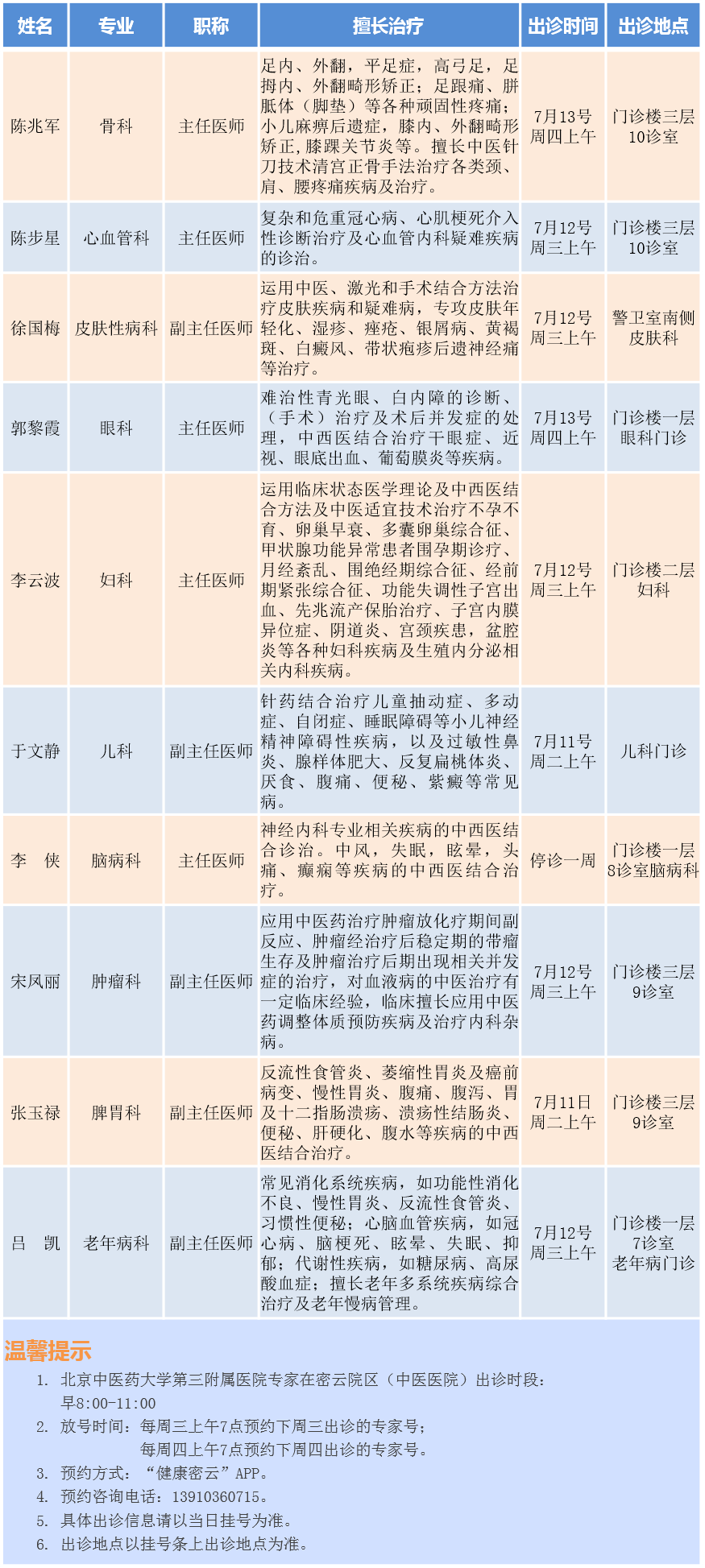 北京中医药大学第三附属医院专家密云院区出诊安排(2023.7.10-7.16)