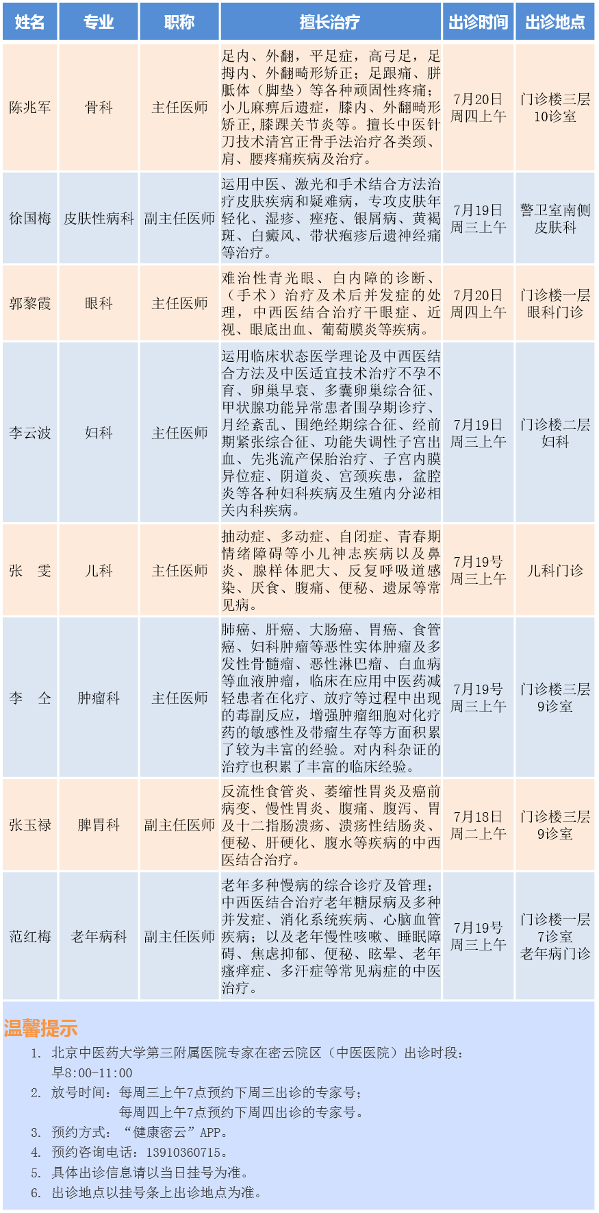 北京中医药大学第三附属医院专家密云院区出诊安排(2023.7.17-7.23)