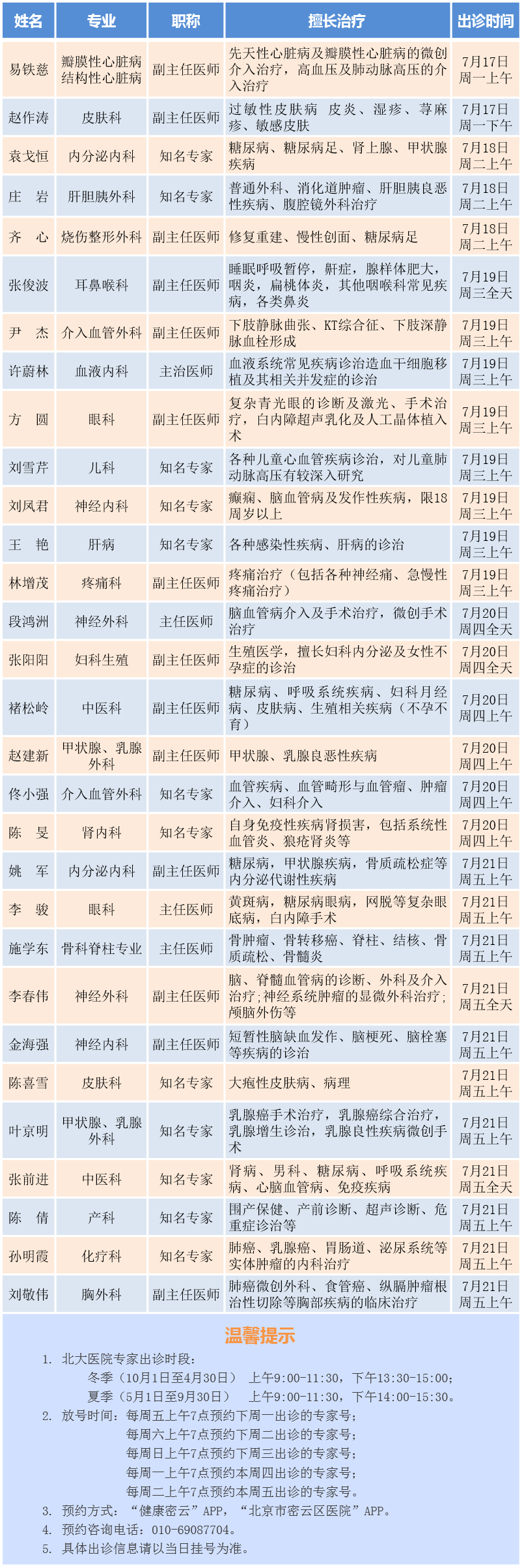 北京大学第一医院专家密云医院出诊安排(2023.7.17-7.21)