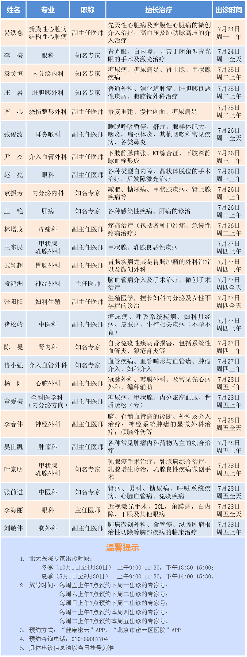 北京大学第一医院专家密云医院出诊安排(2023.7.24-7.28)