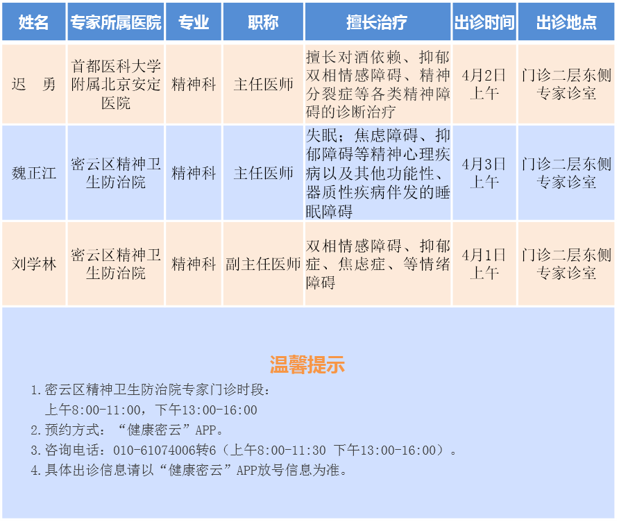 北京市密云区精神卫生防治院专家门诊安排(2024.4.1-4.7)