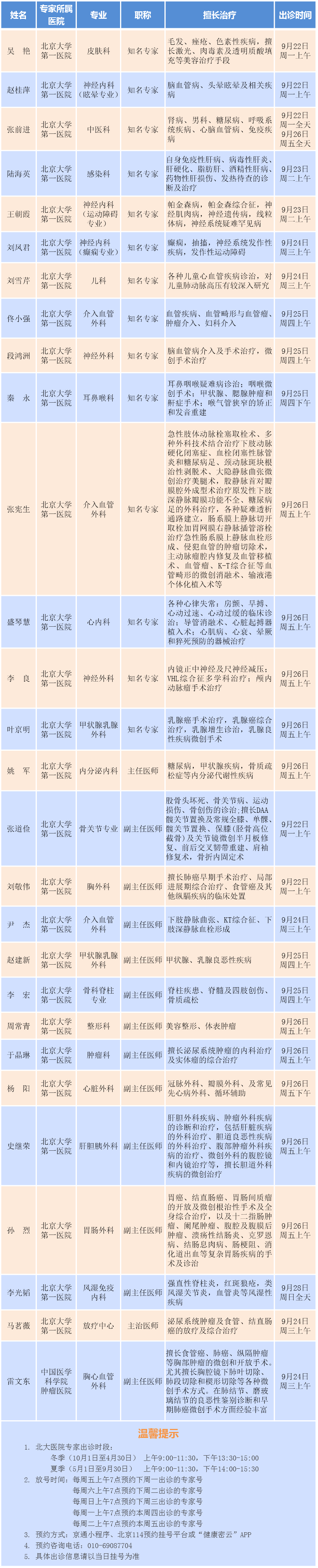 北京大学第一医院专家密云医院出诊安排(2025.9.22-9.28)