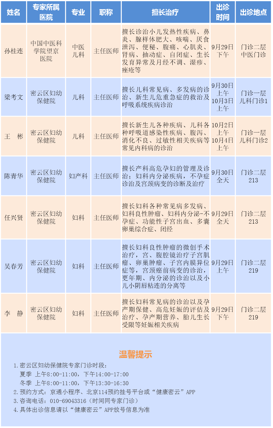 北京市密云区妇幼保健院专家门诊安排(2025.9.29-10.5)