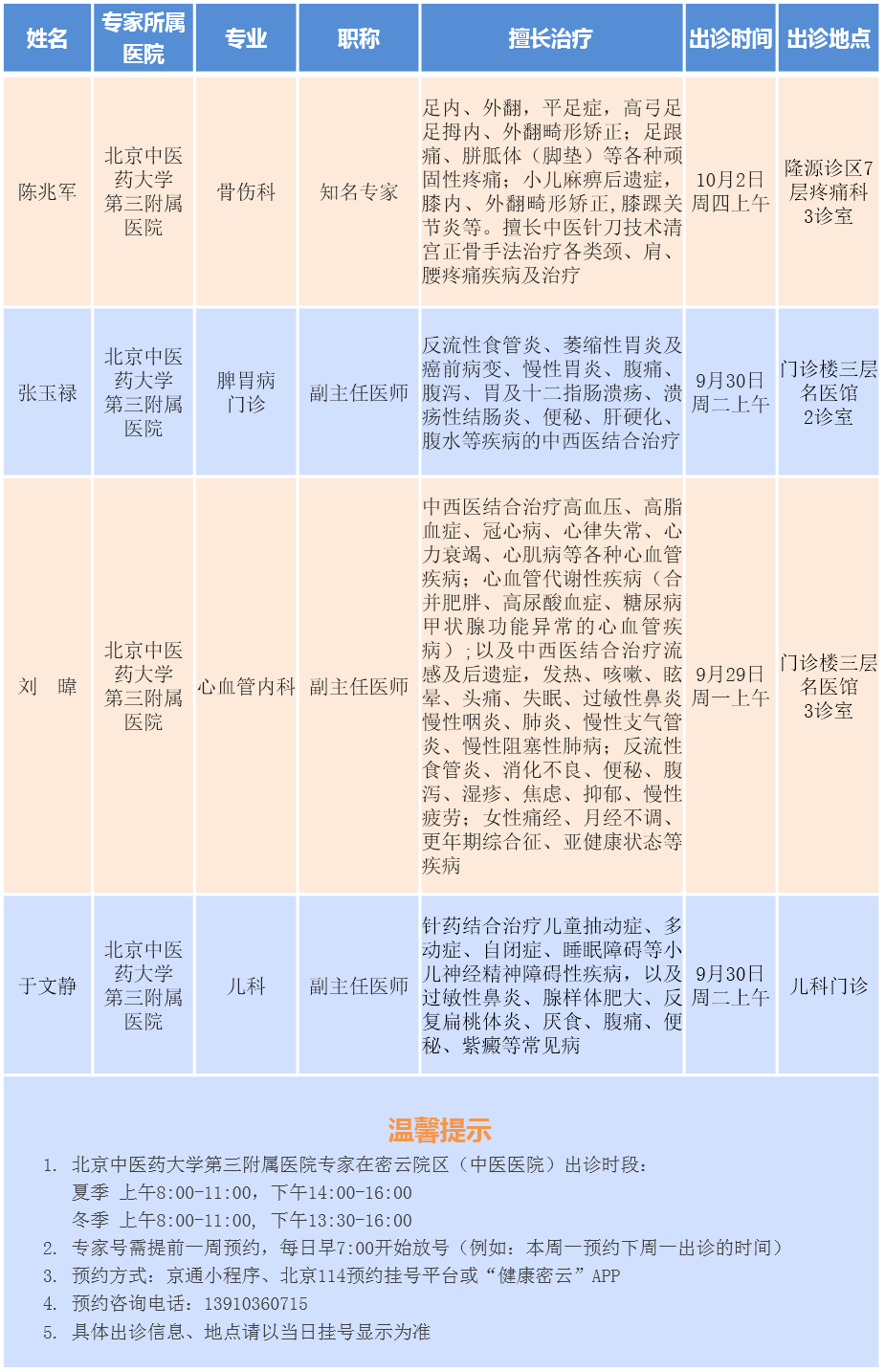 北京中医药大学第三附属医院专家密云院区出诊安排(2025.9.29-10.5)