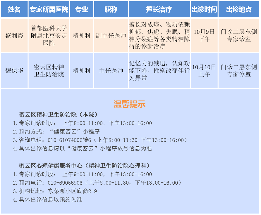 北京市密云区精神卫生防治院专家门诊安排(2025.10.6-10.12)