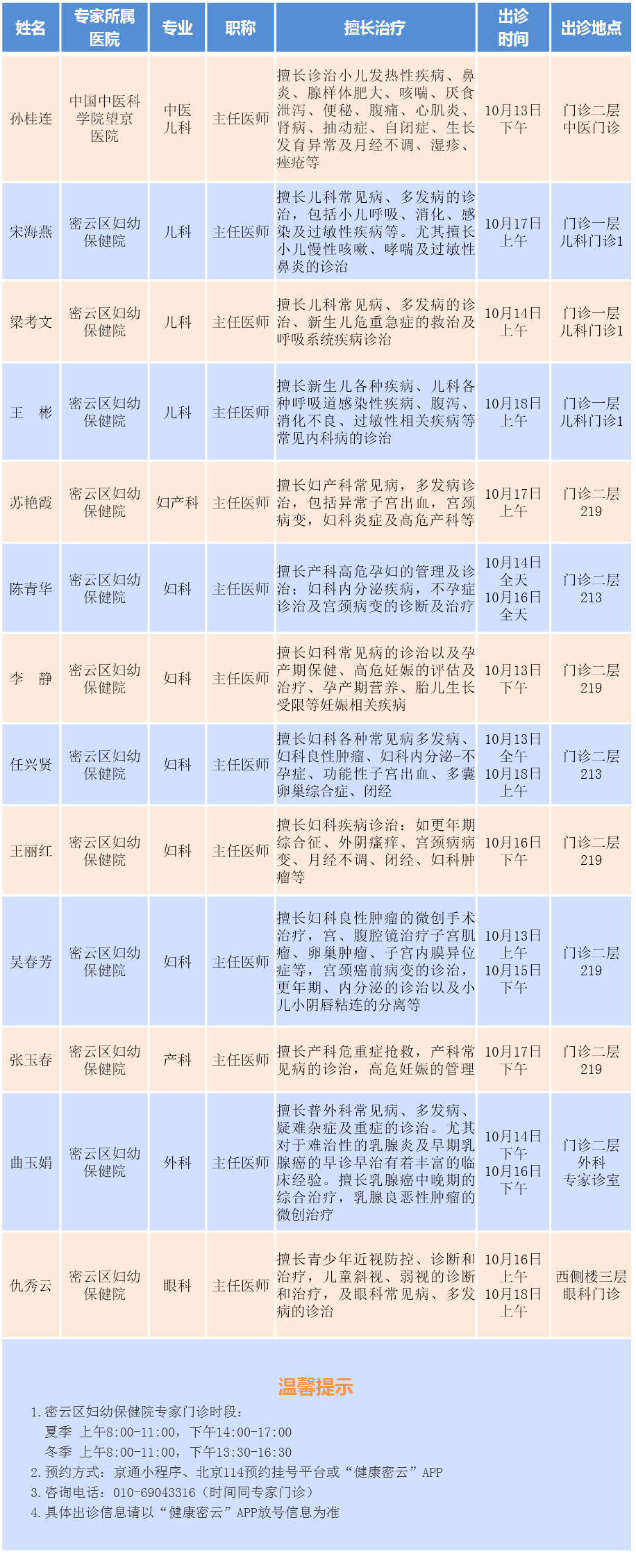 北京市密云区妇幼保健院专家门诊安排(2025.10.13-10.19)