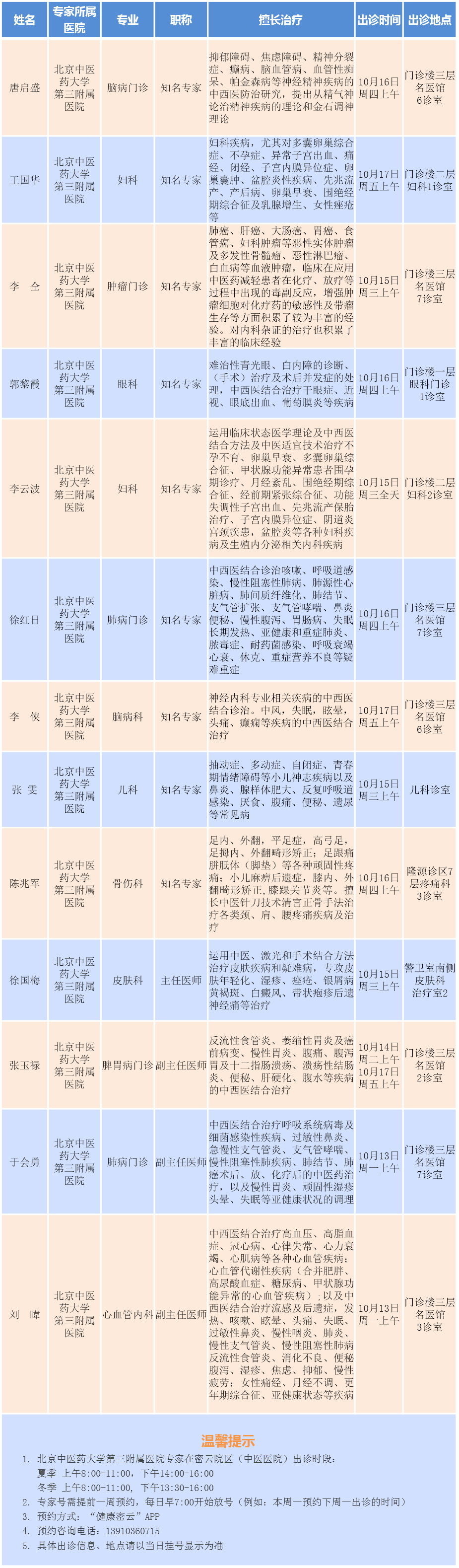 北京中医药大学第三附属医院专家密云院区出诊安排(2025.10.13-10.19)