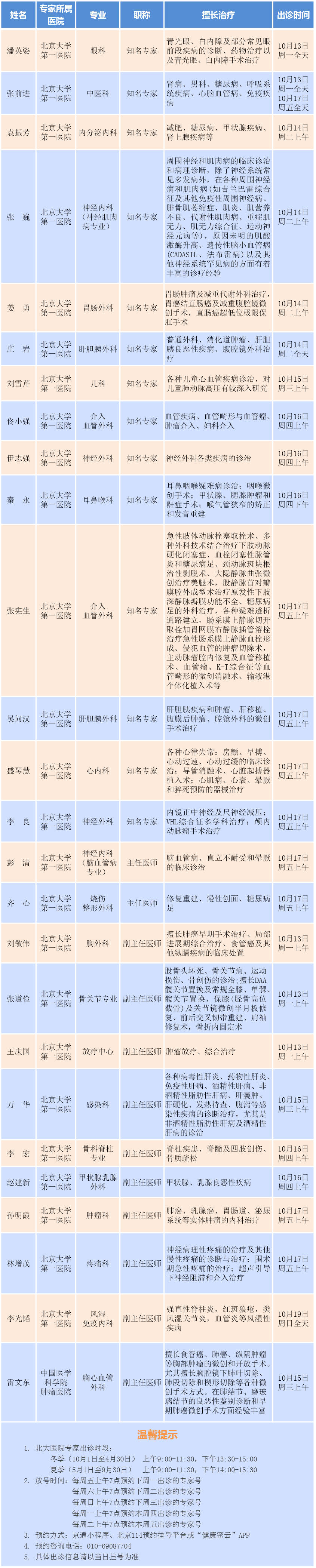 北京大学第一医院专家密云医院出诊安排(2025.10.13-10.19)