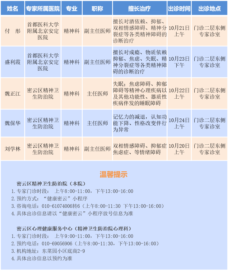 北京市密云区精神卫生防治院专家门诊安排(2025.10.20-10.26)