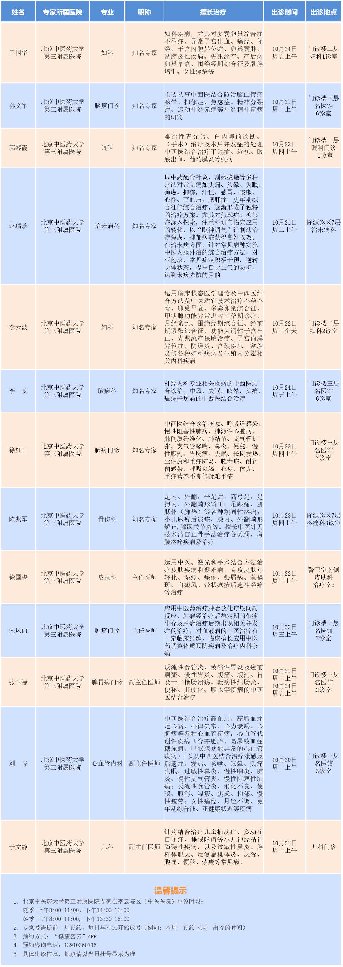 北京中医药大学第三附属医院专家密云院区出诊安排(2025.10.20-10.26)