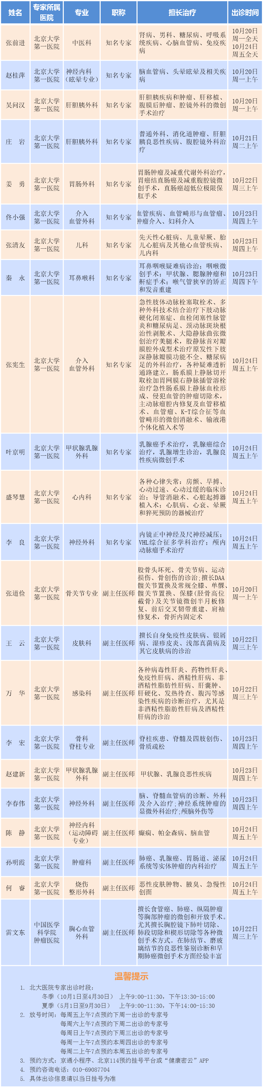 北京大学第一医院专家密云医院出诊安排(2025.10.20-10.26)