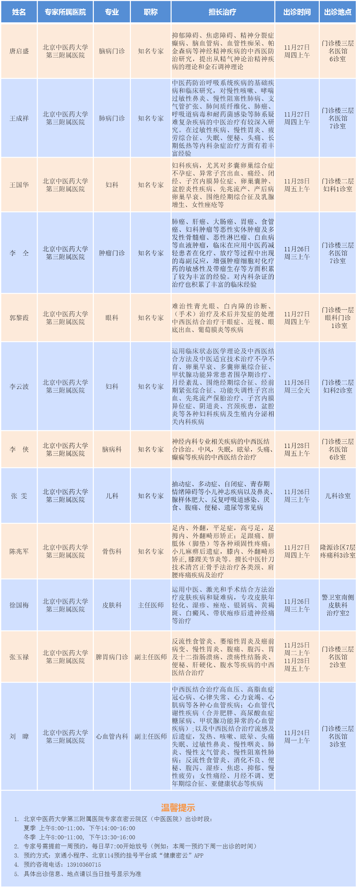 北京中医药大学第三附属医院专家密云院区出诊安排(2025.11.24-11.30)