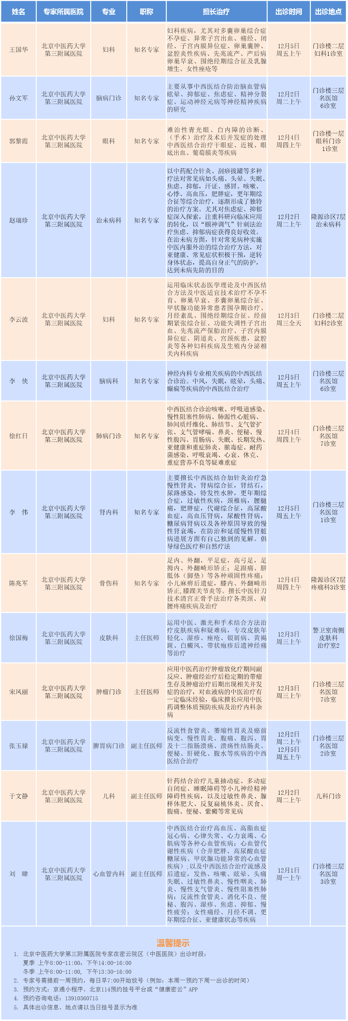 北京中医药大学第三附属医院专家密云院区出诊安排(2025.12.1-12.7)