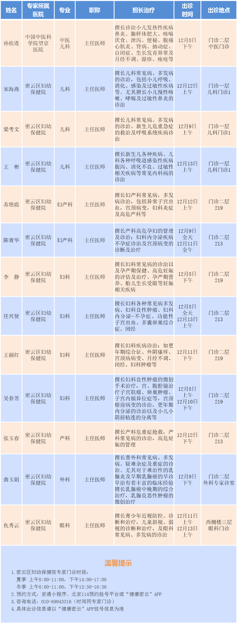 北京市密云区妇幼保健院专家门诊安排(2025.12.8-12.14)