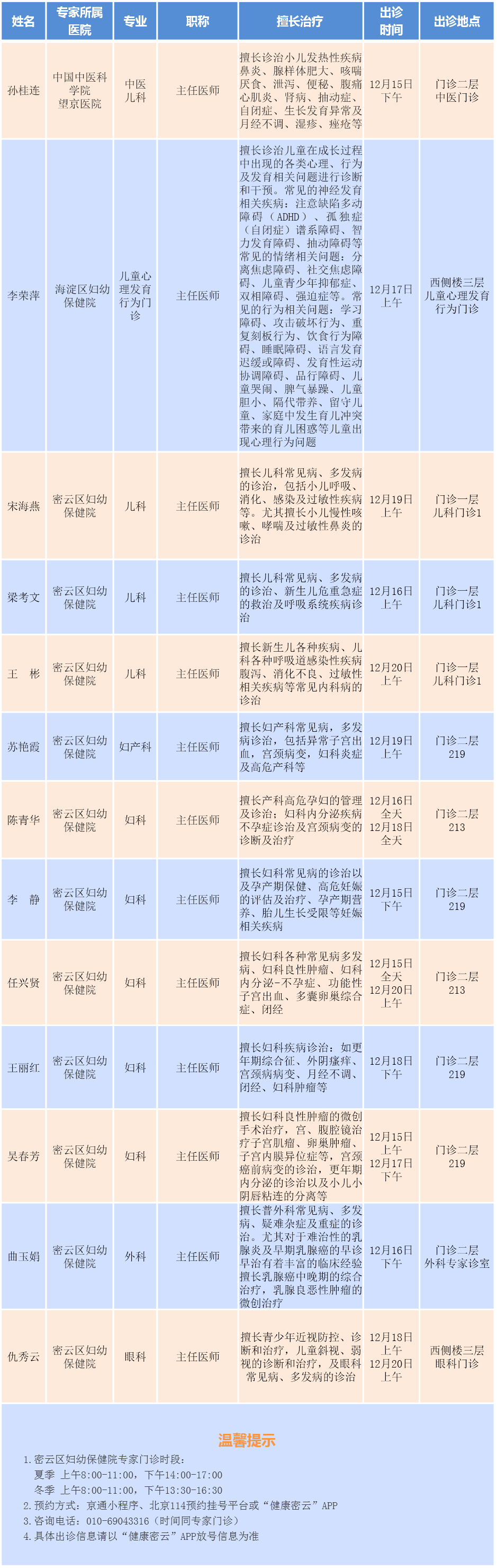 北京市密云区妇幼保健院专家门诊安排(2025.12.15-12.21)