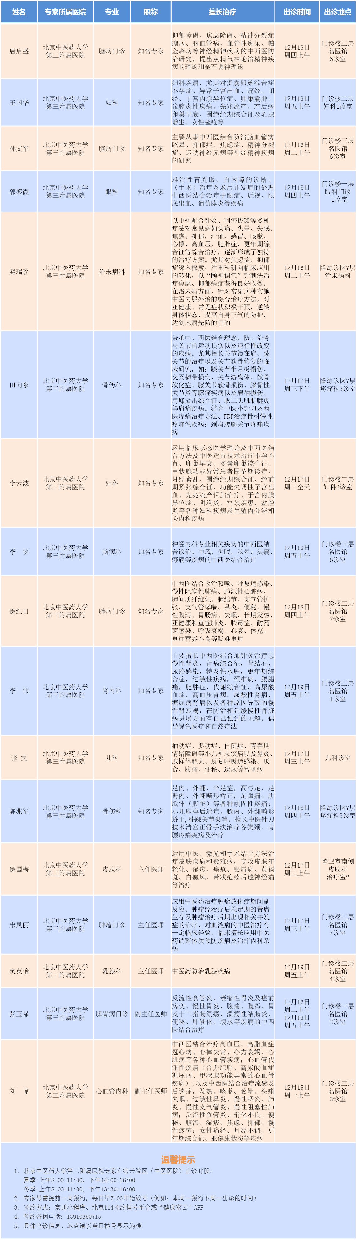 北京中医药大学第三附属医院专家密云院区出诊安排(2025.12.15-12.21)