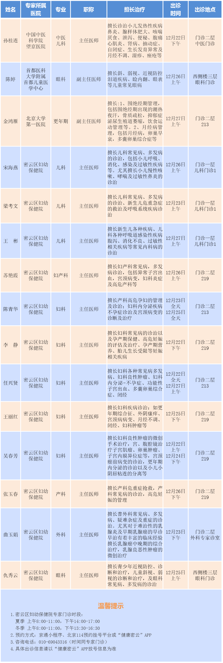 北京市密云区妇幼保健院专家门诊安排(2025.12.22-12.28)