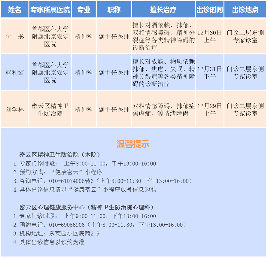 北京市密云区精神卫生防治院专家门诊安排(2025.12.29-2026.1.4)