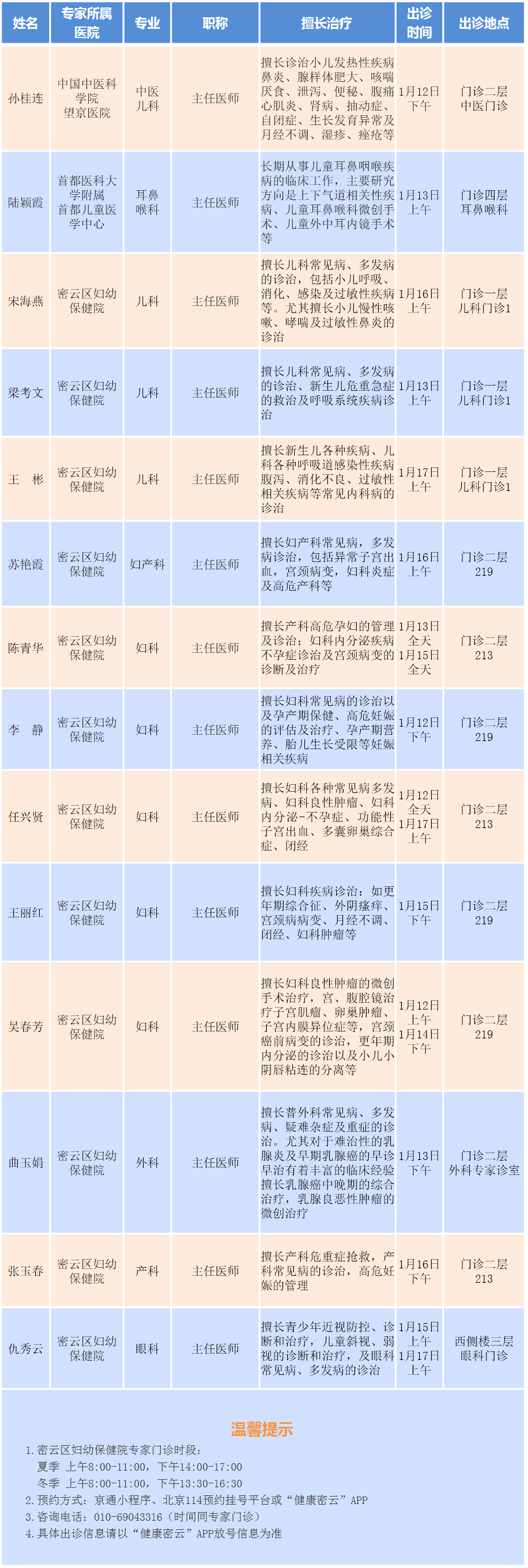 北京市密云区妇幼保健院专家门诊安排(2026.1.12-1.18)