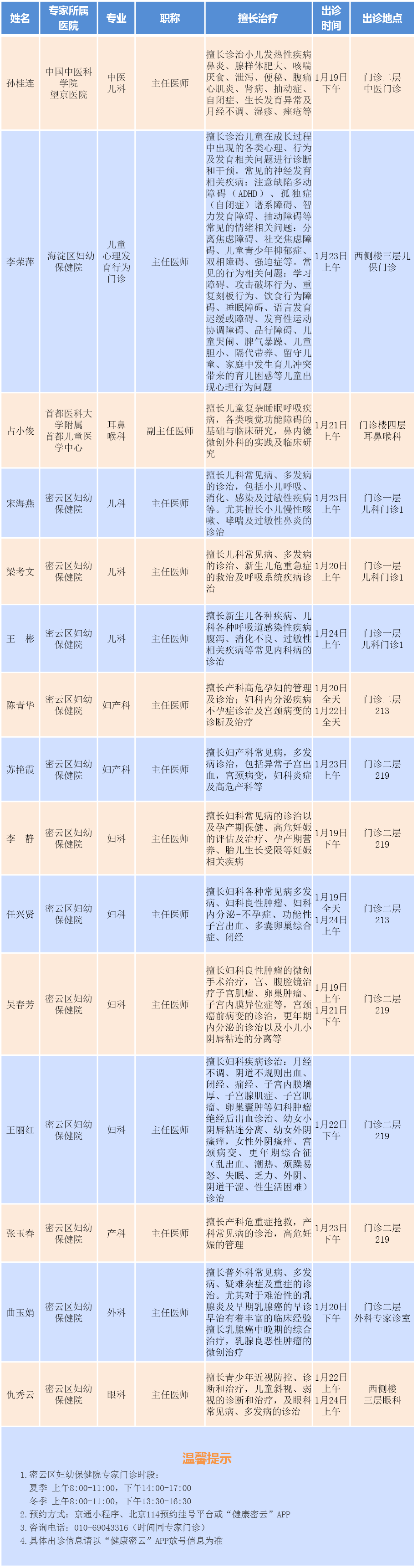 北京市密云区妇幼保健院专家门诊安排(2026.1.19-1.25)