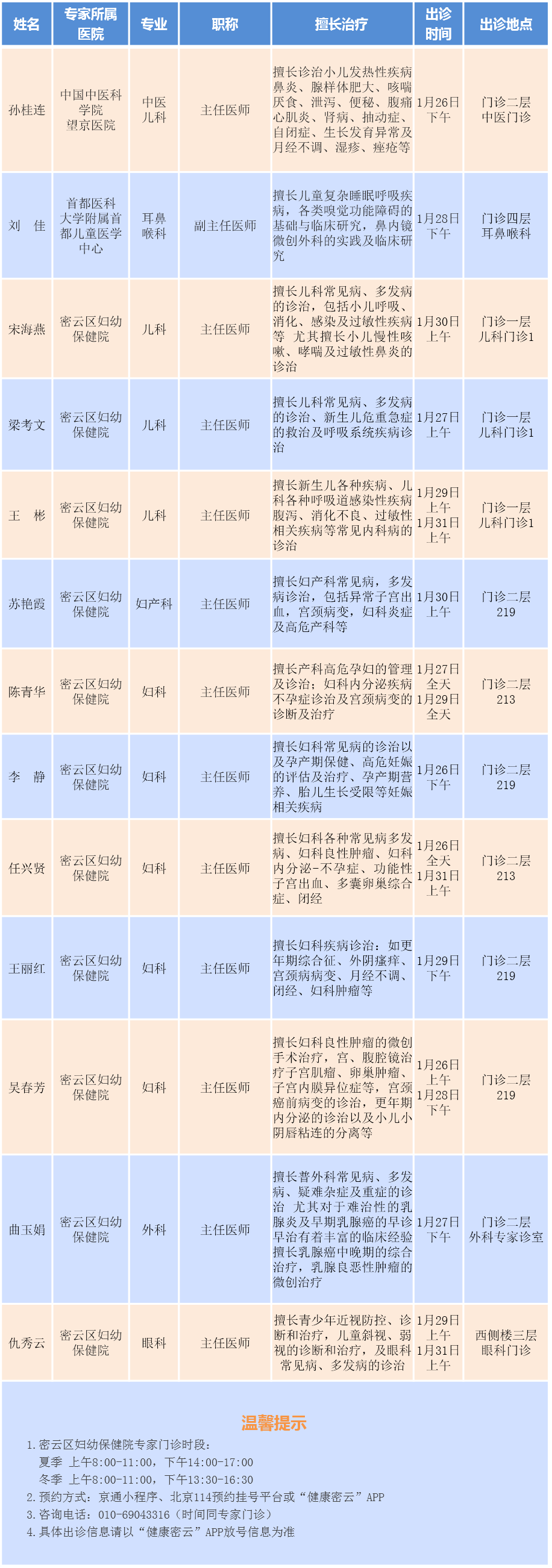 北京市密云区妇幼保健院专家门诊安排(2026.1.26-2.1)
